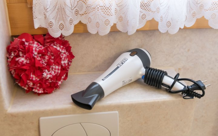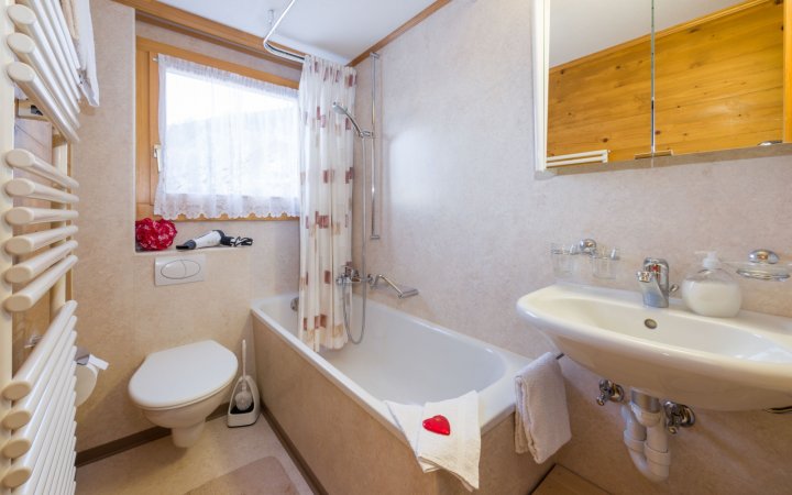- Bathroom with bathtub/shower, WC, washbasin with mirror cupboard and hairdryer