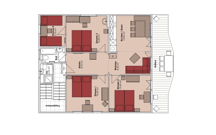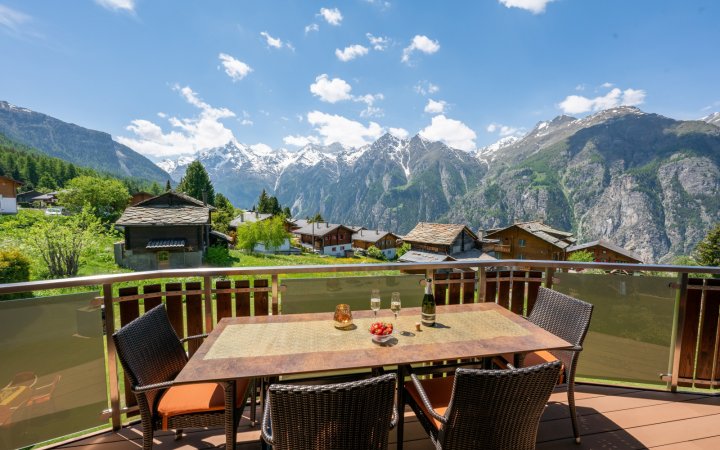 - Own large, sunny balcony on the south side with dining table, seating and free, open panoramic view